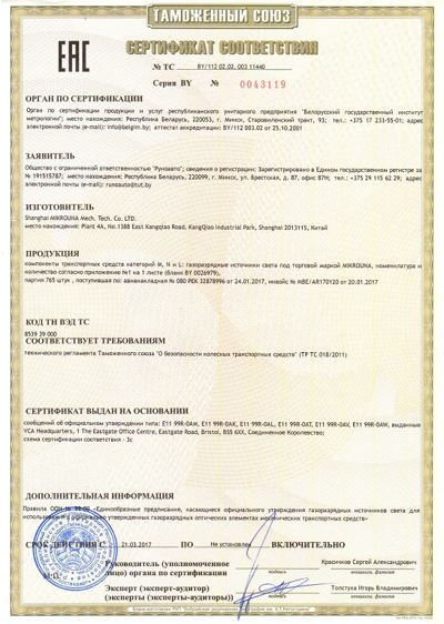 Лампы Mikrouna Blue Glass прошли обязательную сертификацию ЕЭК ООН №99 в Европе и в Республике Беларусь! И допущены к продаже и эксплуатации на дорогах общего пользования.